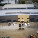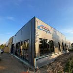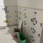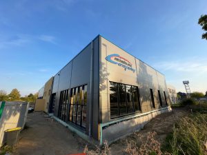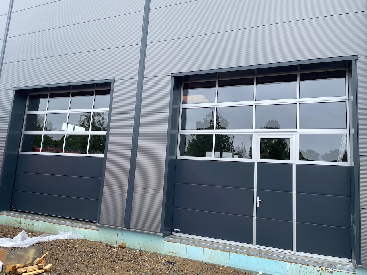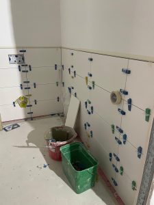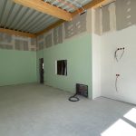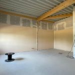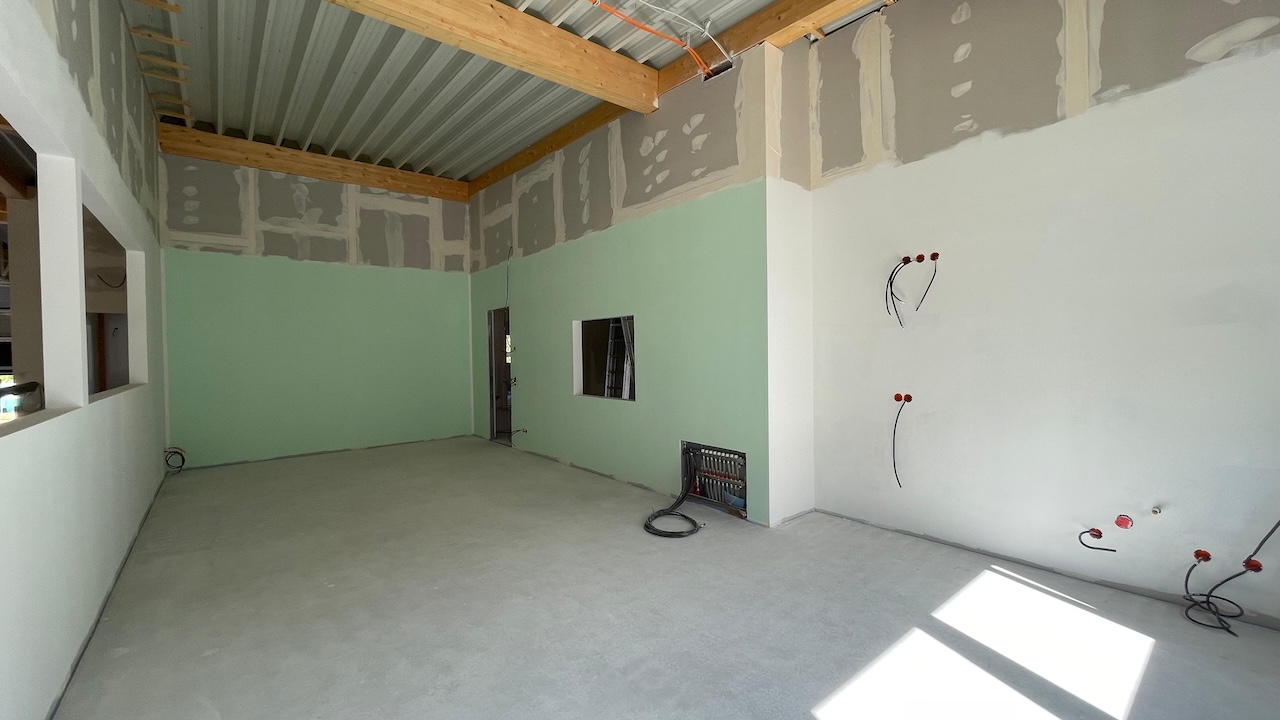 Die Außenfenster, Türen und Tore sind montiert, so dass ein Regenschauer unserem neuen Gebäude nichts mehr anhaben kann. Ebenso sind alle Wände gestellt und verspachtelt. Die obere Etage hat bereits Farbe bekommen und die Fliesenleger sind auch so gut wie fertig.