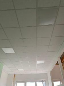 Bald ist die obere Etage bereit zum einräumen, denn Steckdosen sind bereits alle verbaut. Die schöne Akustikdecke hat ebenfalls schon seine Lichter bekommen. Jetzt fehlt nur noch der Fußbodenbelag!