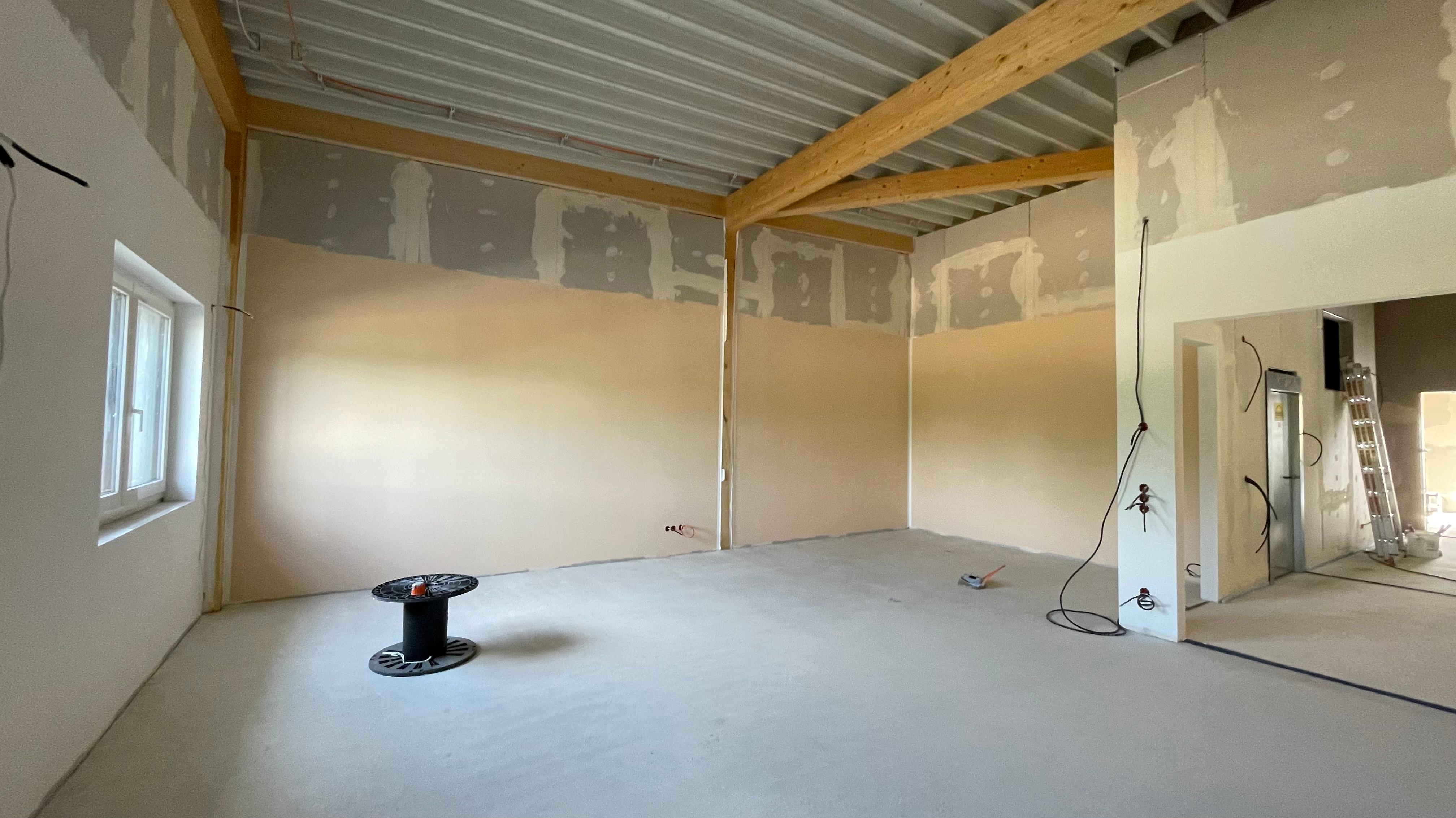 Die Außenfenster, Türen und Tore sind montiert, so dass ein Regenschauer unserem neuen Gebäude nichts mehr anhaben kann. Ebenso sind alle Wände gestellt und verspachtelt. Die obere Etage hat bereits Farbe bekommen und die Fliesenleger sind auch so gut wie fertig.